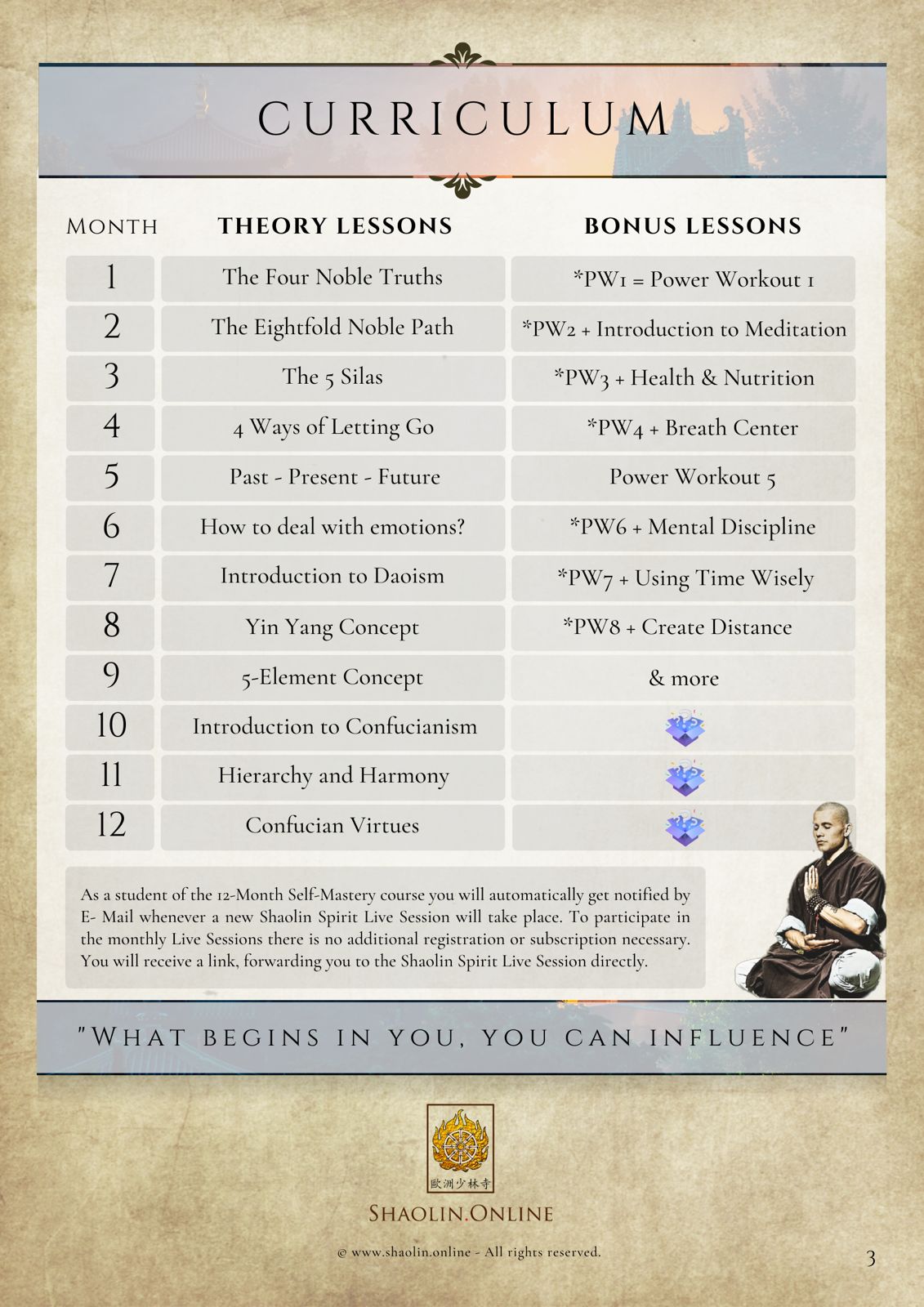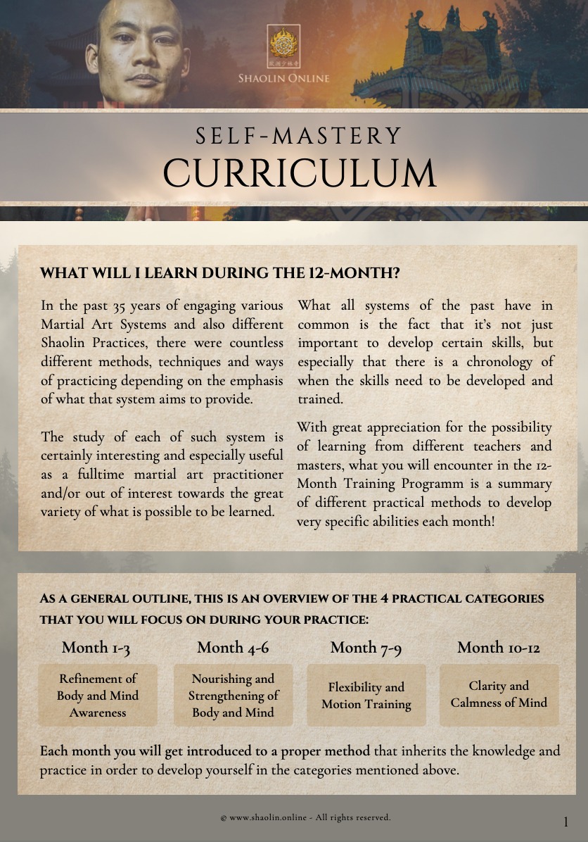 With great appreciation for the possibility of learning from different teachers and masters, what you will encounter in the 12-Month Training Programm is a summary of different practical methods to develop very specific abilities each month!